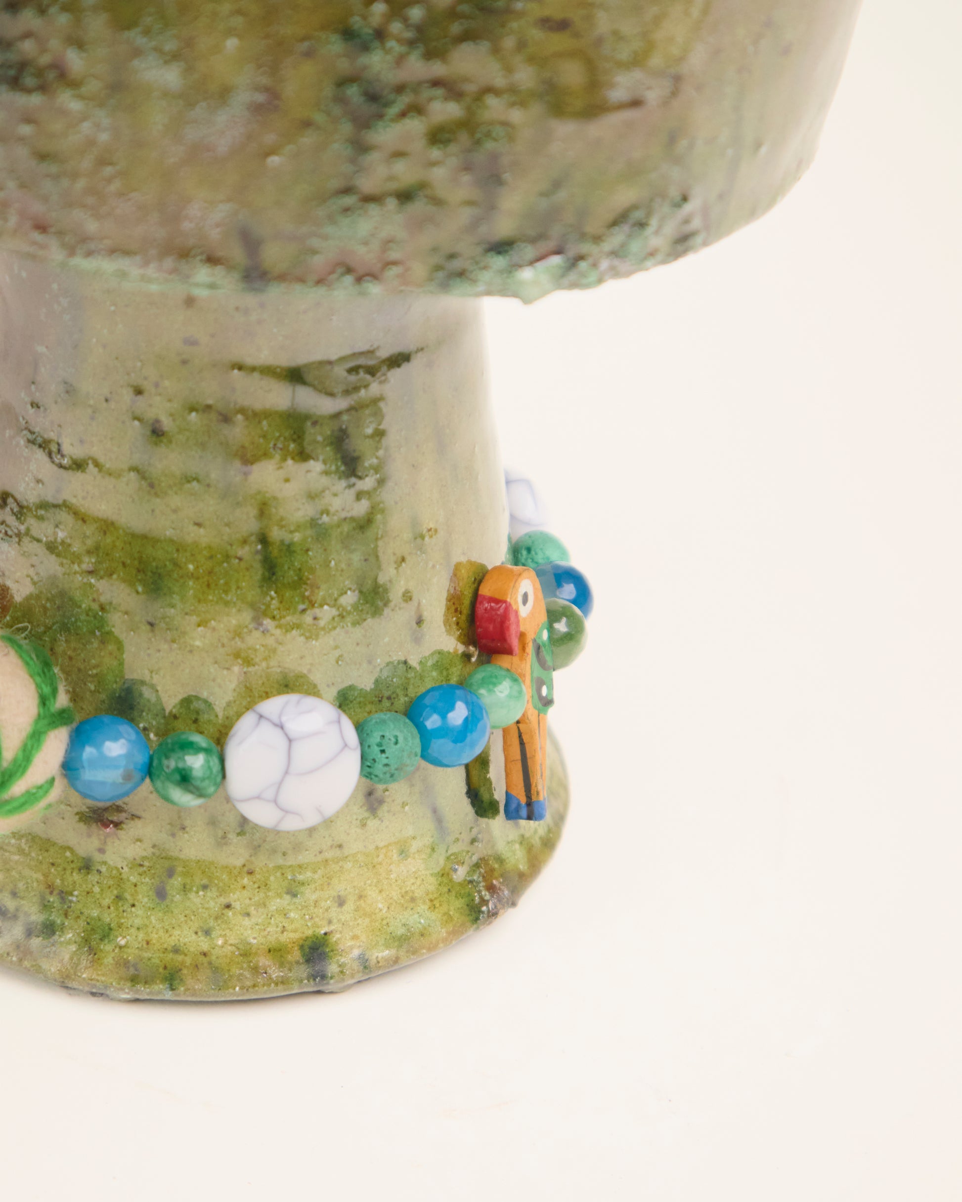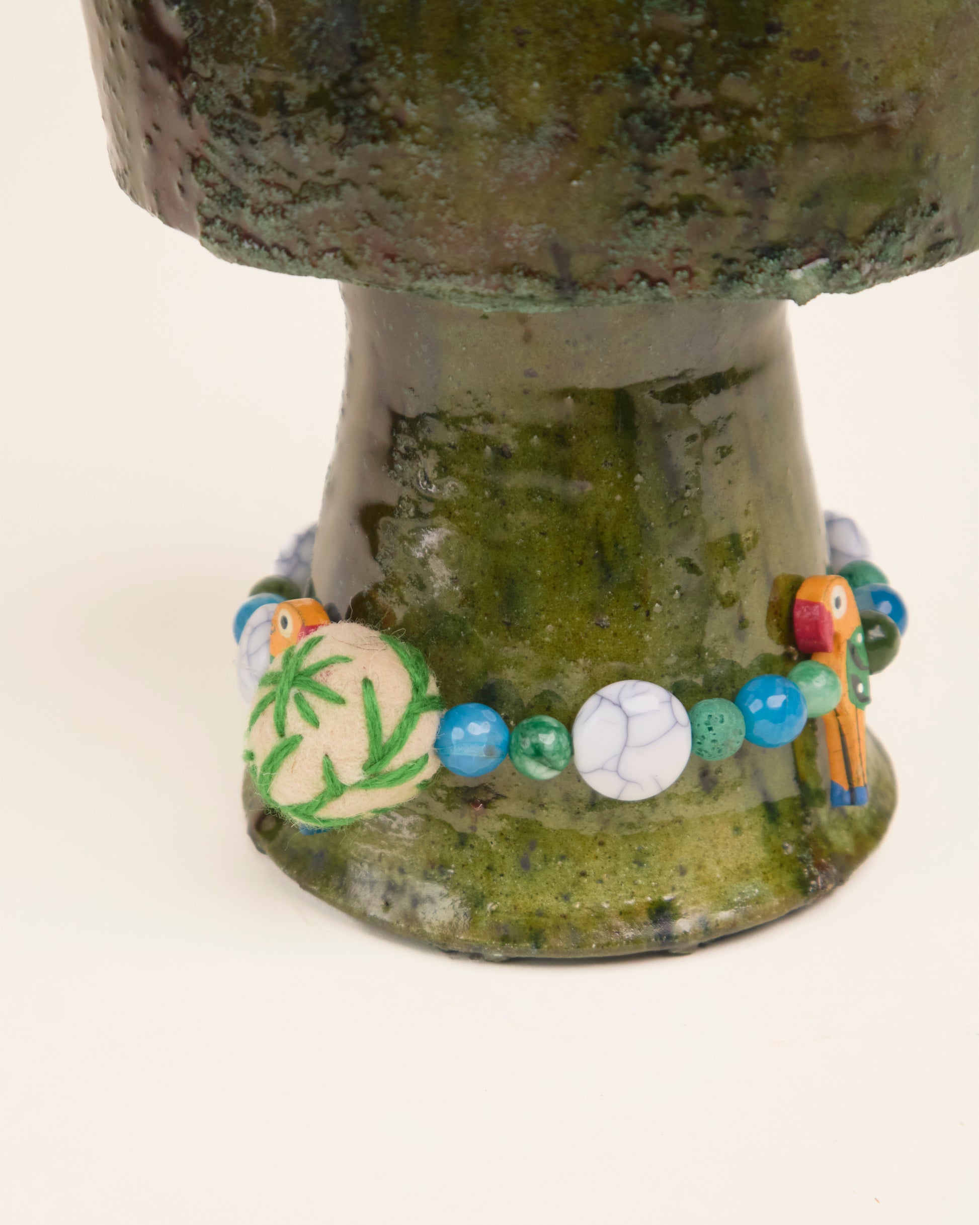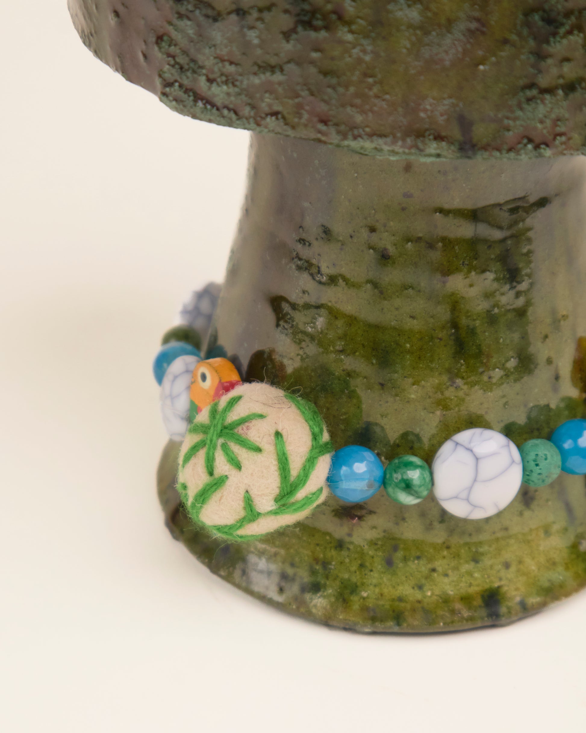 À cette base brute et authentique, Manon vient apporter sa touche personnelle : de délicats bijoux de perles faits main, qu’elle compose avec amour dans son atelier. Ces ornements viennent enlacer la bougie, créant une pièce poétique, mêlant terre et lumière, tradition et création.