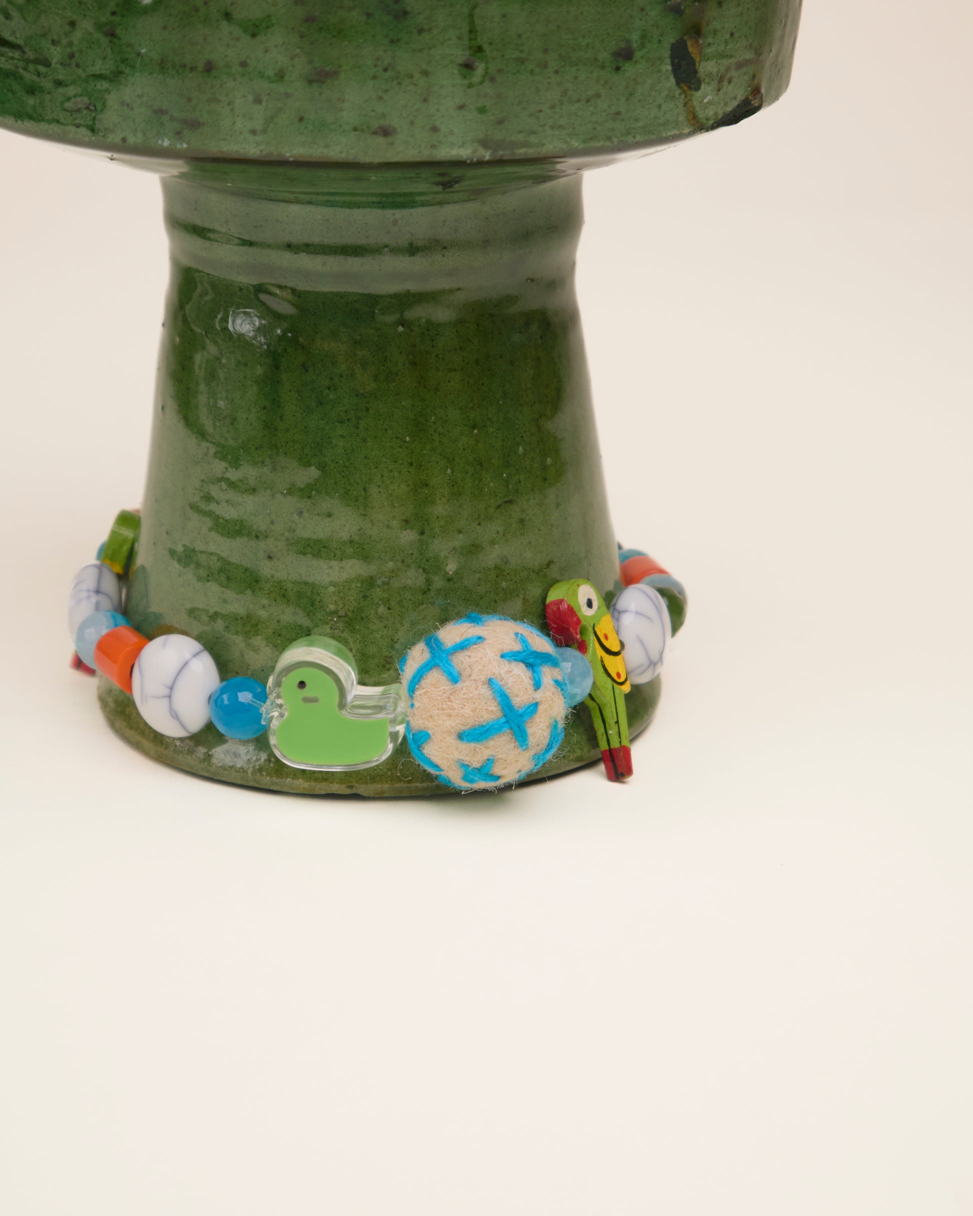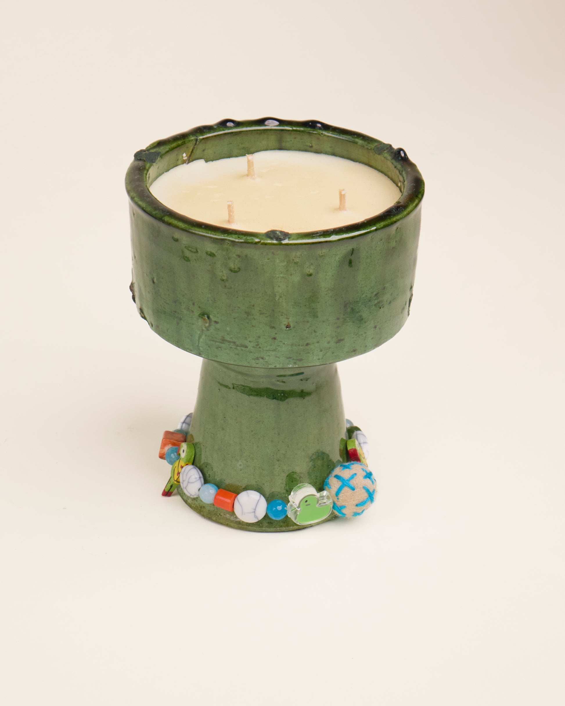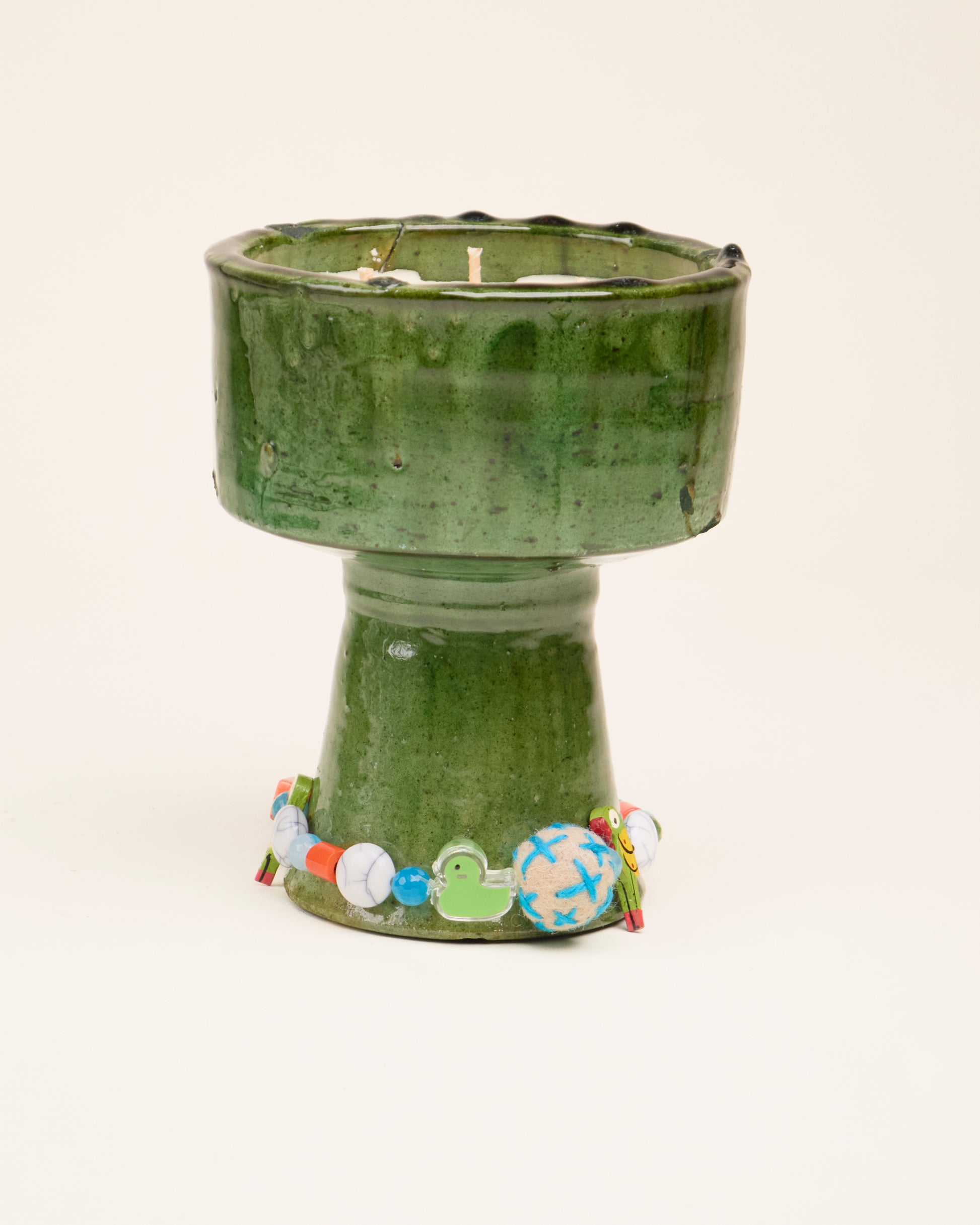 À cette base brute et authentique, Manon vient apporter sa touche personnelle : de délicats bijoux de perles faits main, qu’elle compose avec amour dans son atelier. Ces ornements viennent enlacer la bougie, créant une pièce poétique, mêlant terre et lumière, tradition et création.