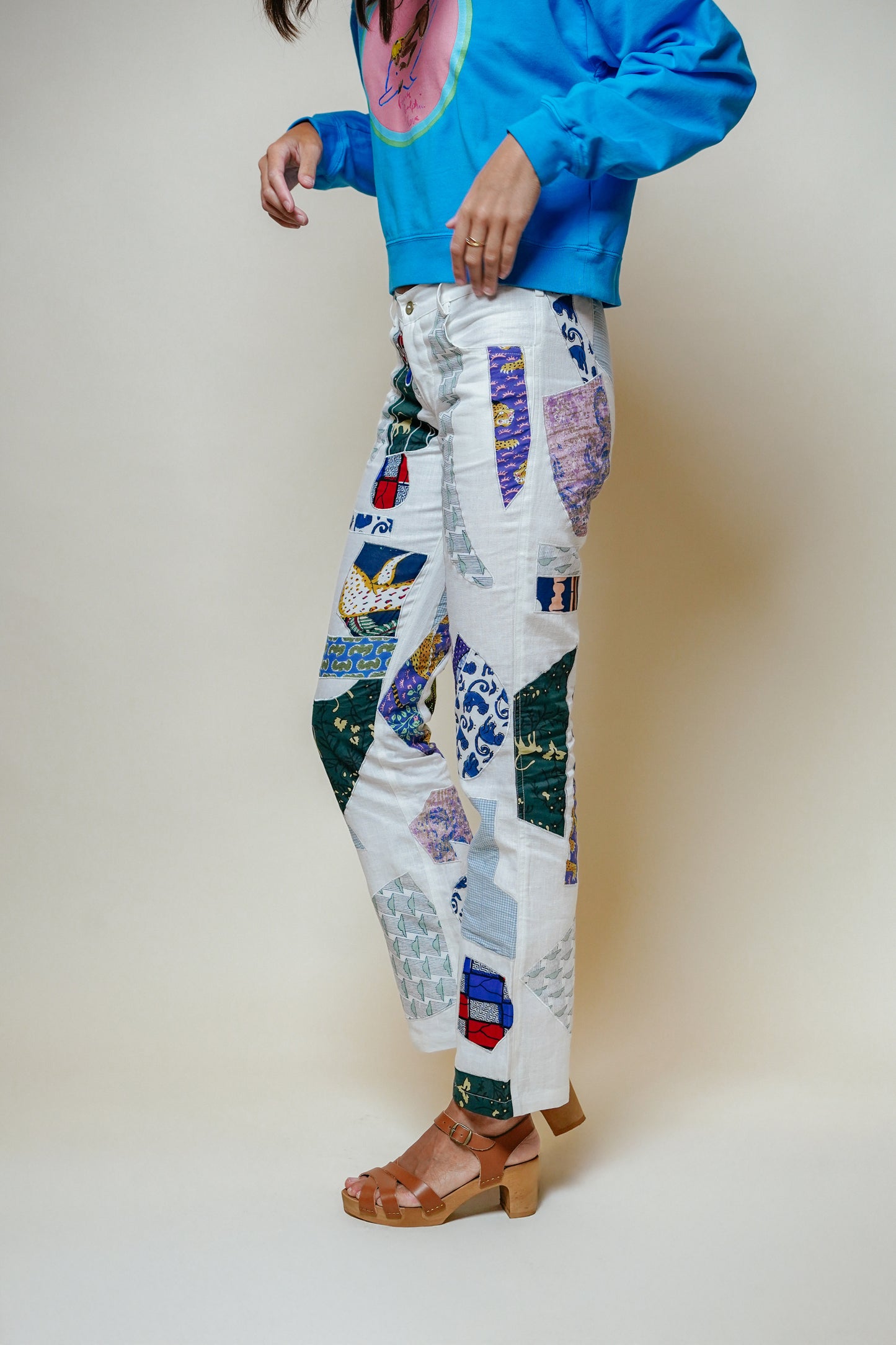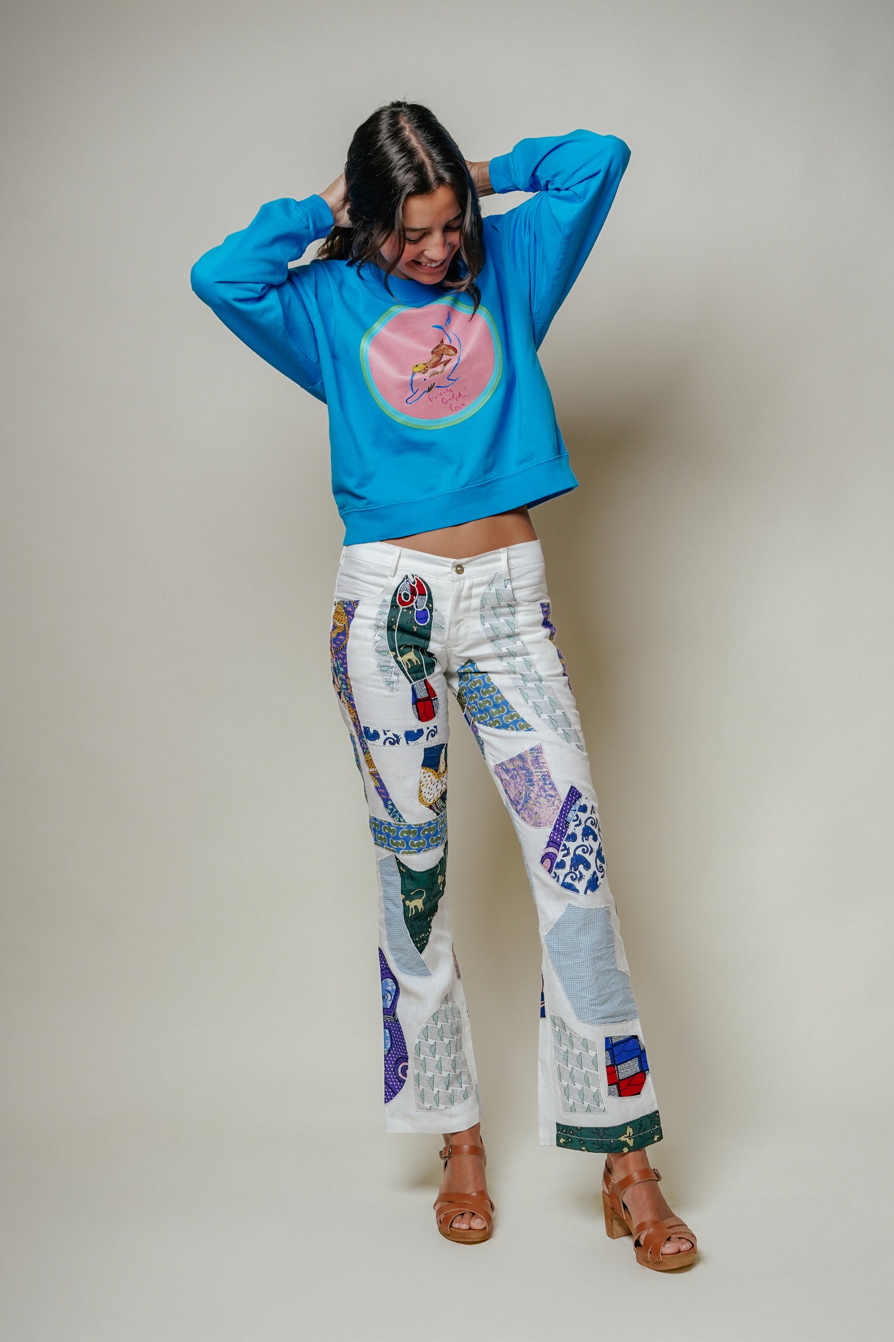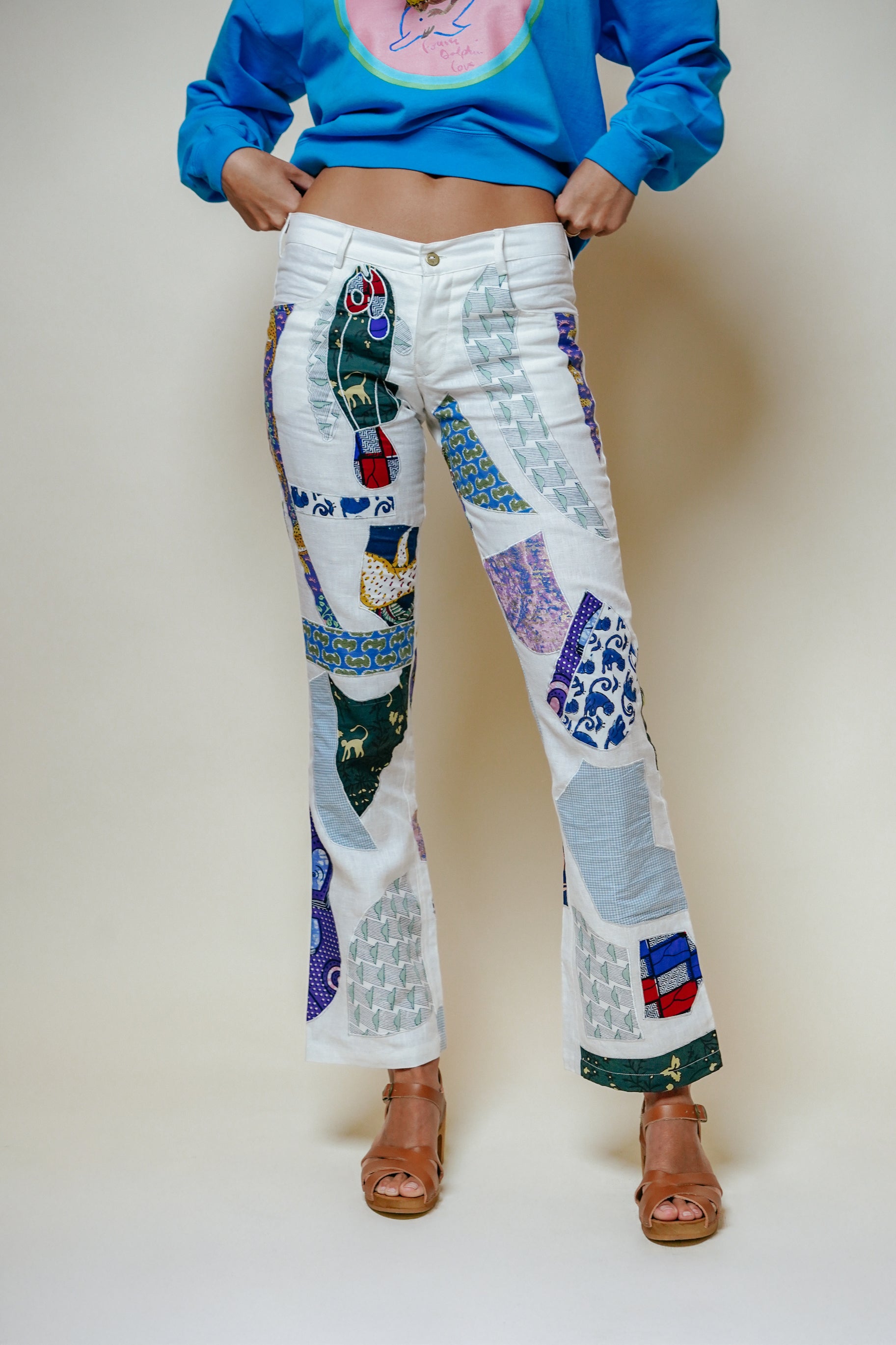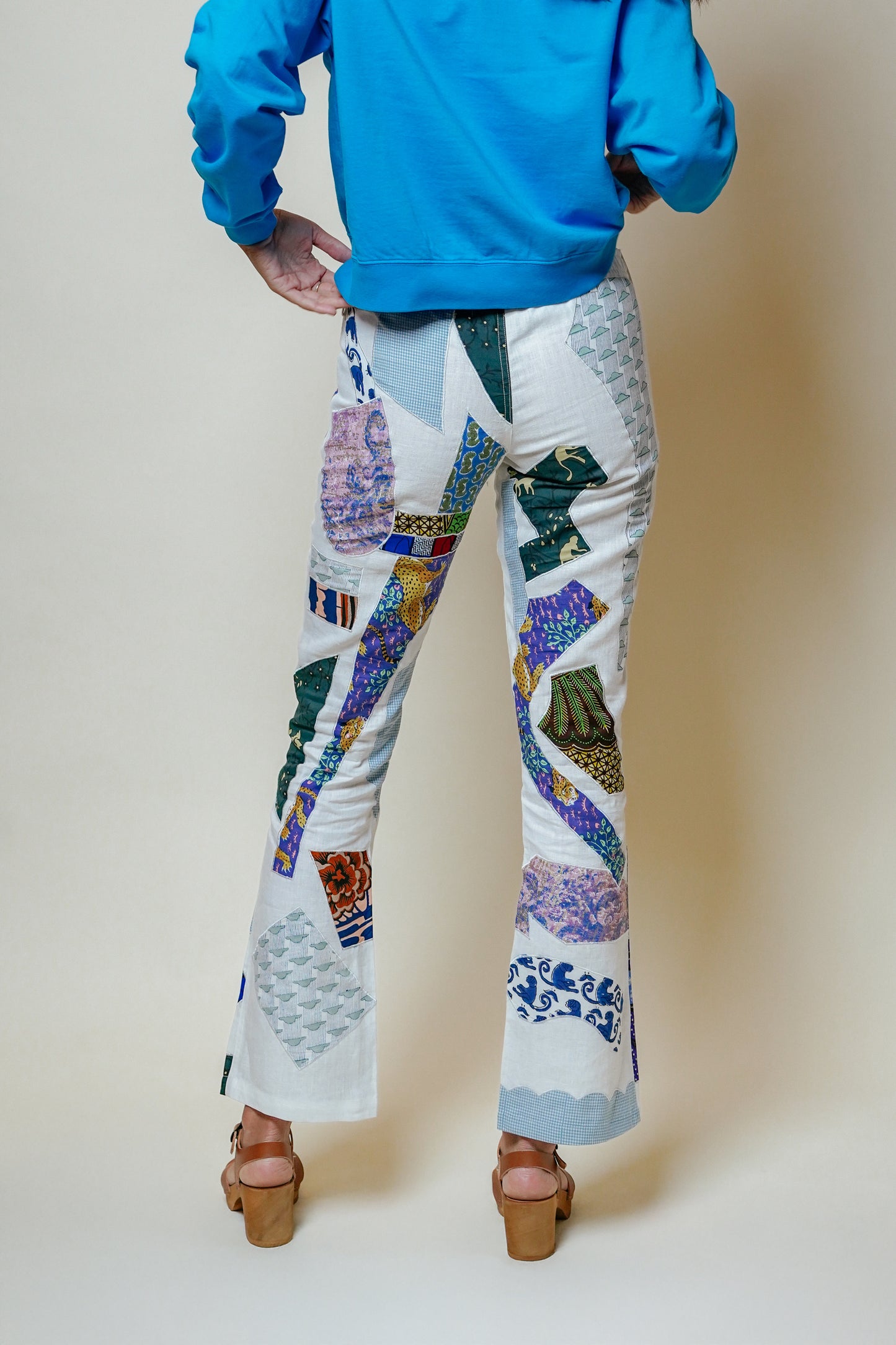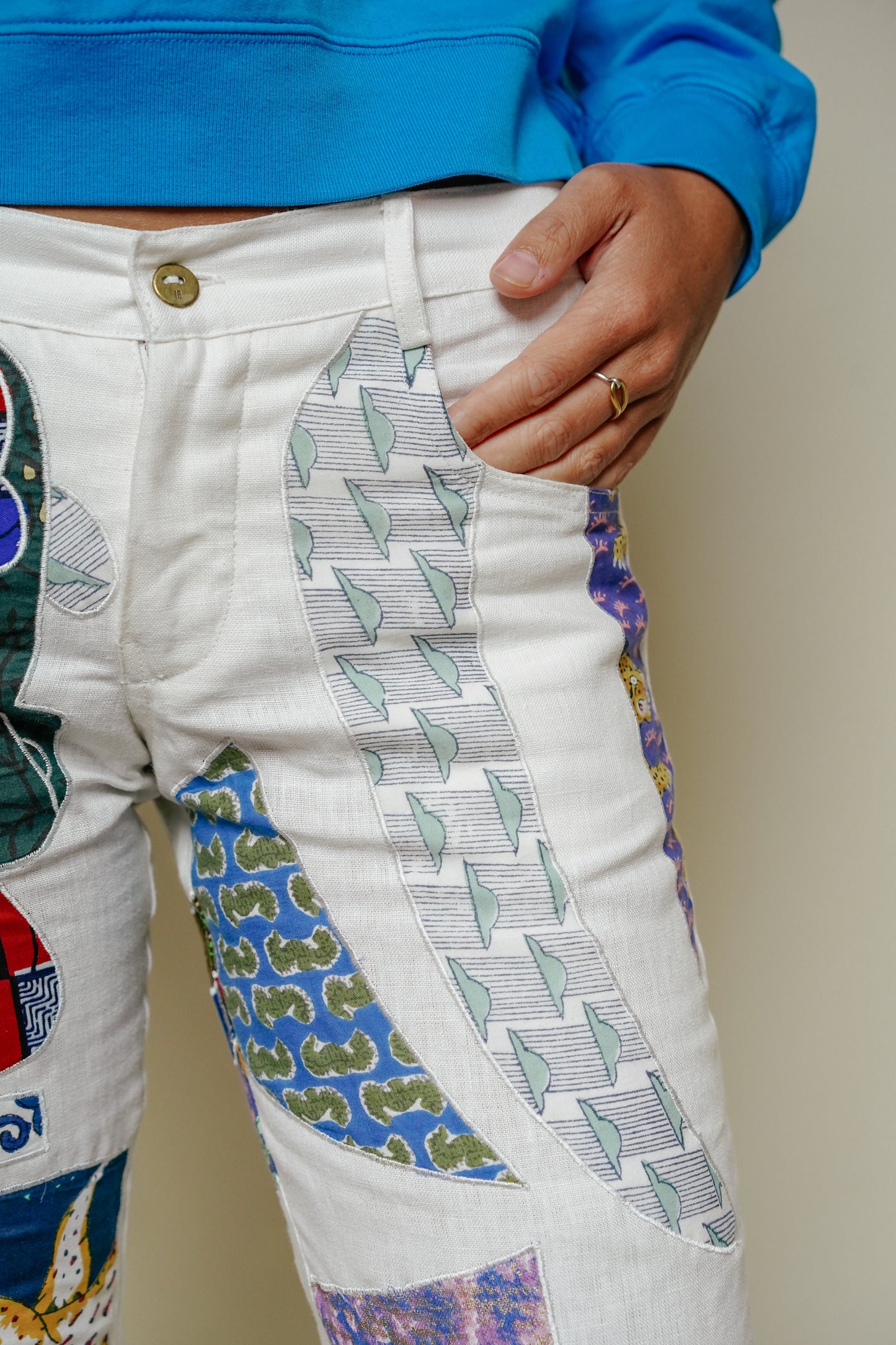 Inspiré du boubou patchwork à l'homme, les empiècements du pantalon Gina sont découpés dans les tissus de nos iconiques boubous. Chaque pièce raconte une histoire, chaque couture fait écho à un savoir-faire.