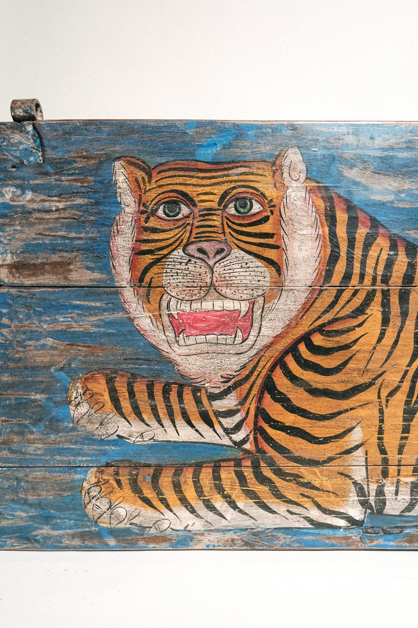 Chaque porte raconte une histoire. Sur ce panneau de bois patiné par le temps, un tigre majestueux prend vie, entouré de teintes bleues usées qui rappellent les pigments naturels utilisés dans la région. La peinture, bien qu’altérée par les années, conserve toute sa puissance expressive et son charme brut. Le bois d’acacia, dense et durable, est apprécié pour ses veines naturelles et sa robustesse exceptionnelle.