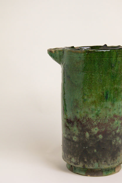 Ce pichet en céramique de Tamegroute est une pièce unique façonnée et émaillée à la main par des artisans du sud du Maroc, perpétuant un savoir-faire ancestral. Sa finition vert profond aux nuances naturelles et sa texture brute lui confèrent une authenticité inégalable.