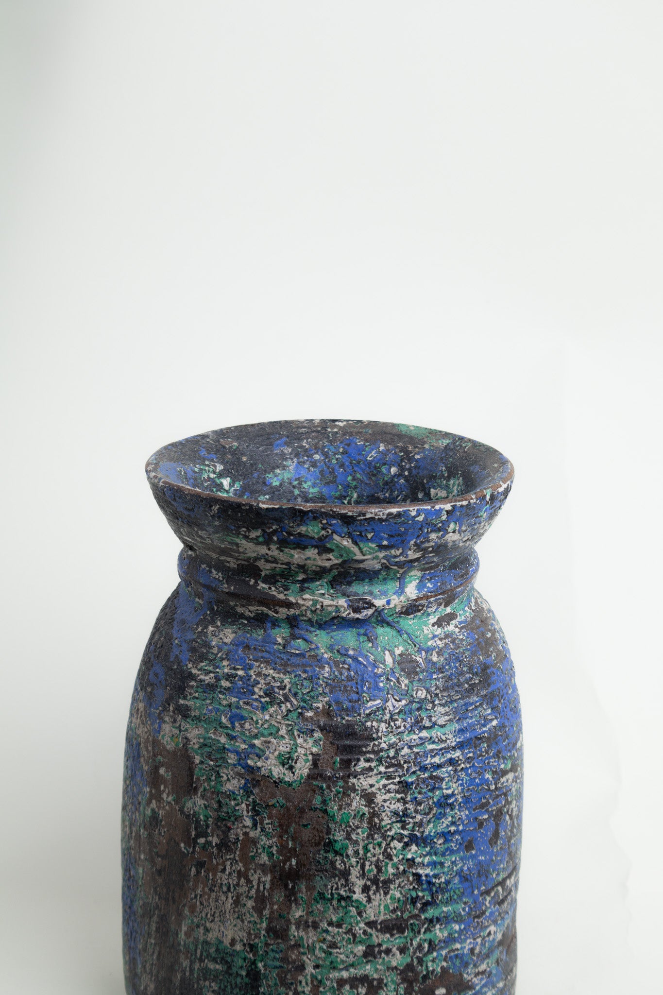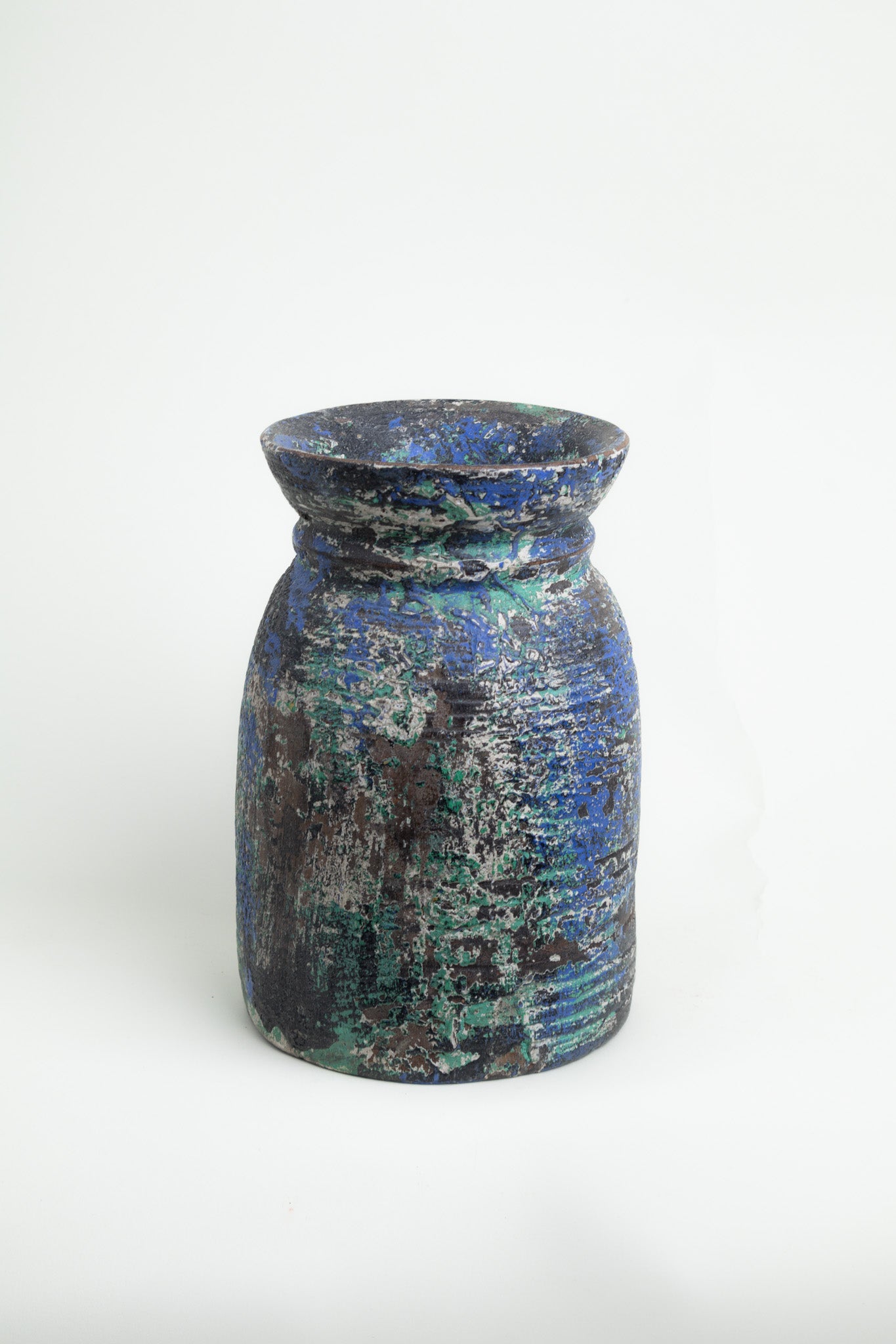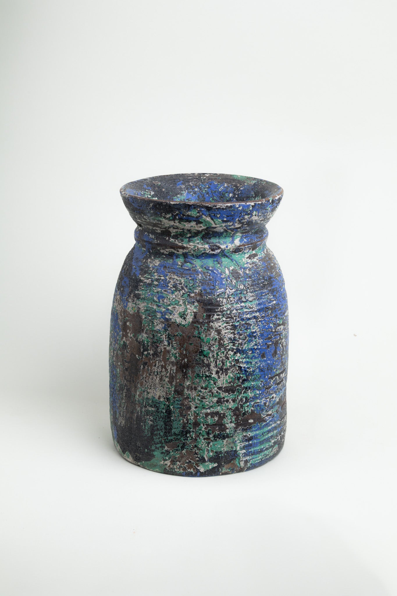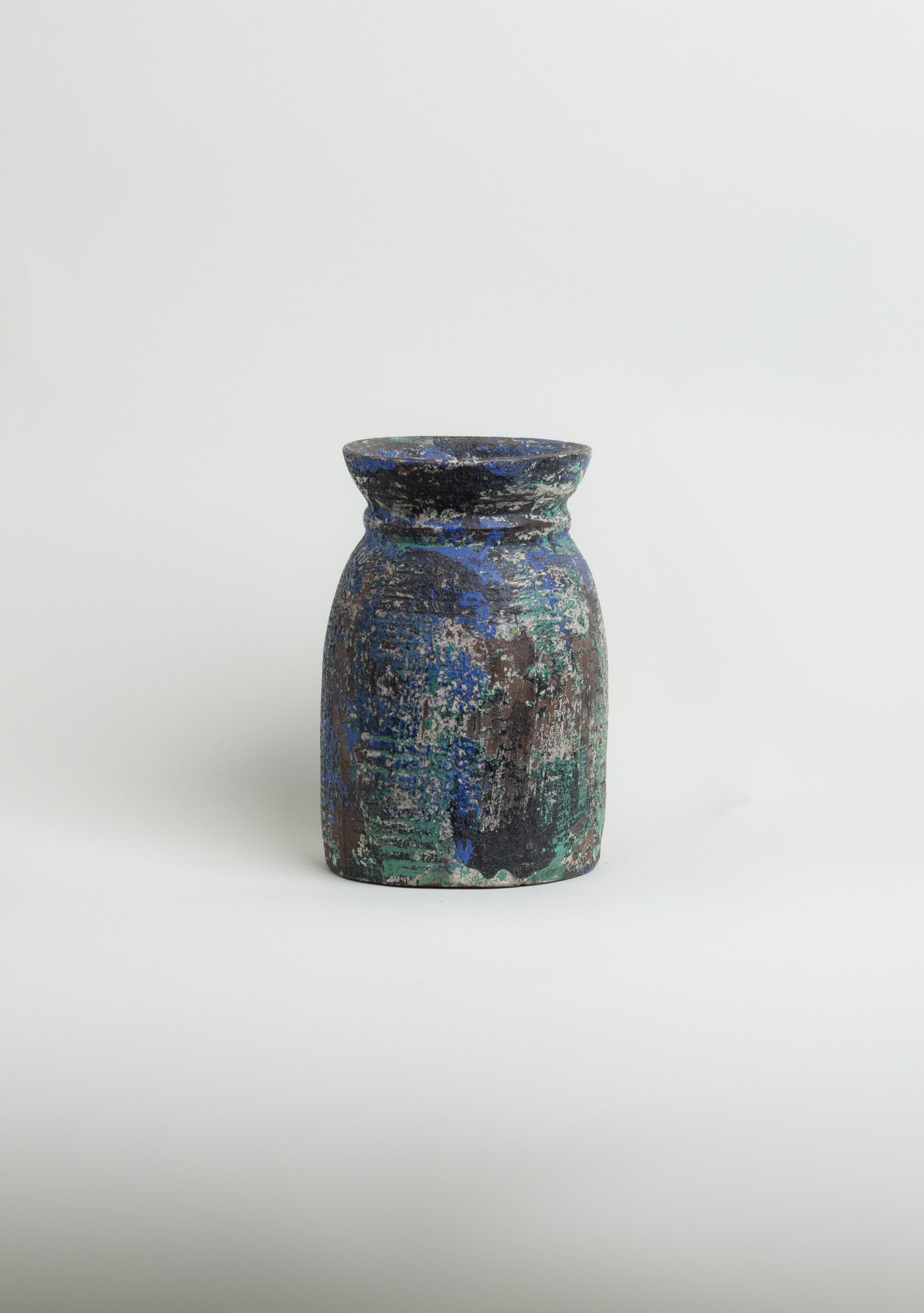 Ici, le pot en bois d'acacia est peint dans des nuances de bleu avec un effet vintage.