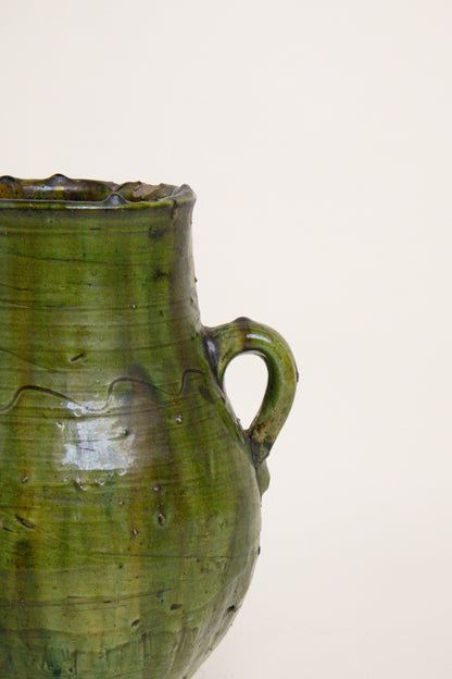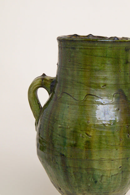 Ce vase en céramique de Tamegroute incarne l’authenticité et le savoir-faire ancestral des artisans du sud du Maroc. Modelé et émaillé à la main, il arbore une teinte verte profonde aux reflets naturels, signature de la poterie de Tamegroute. Son design traditionnel, avec ses anses délicatement façonnées et ses motifs irréguliers, lui confère un charme brut et intemporel.