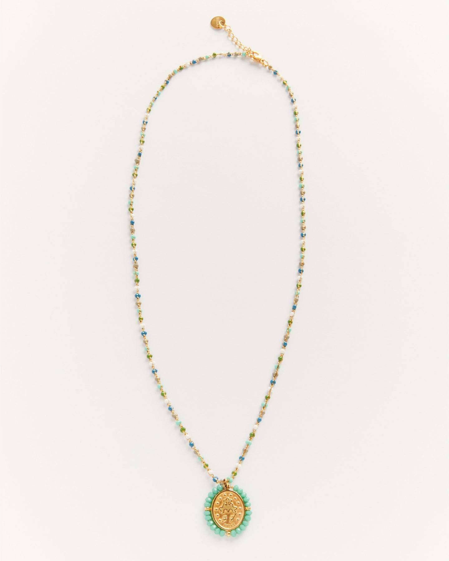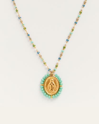 De fines perles bleu azur subliment la chaîne en acier doré et la médaille de la vierge.