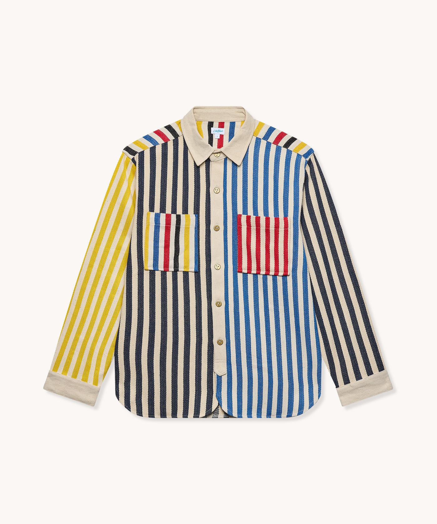 La chemise Paul se distingue par son design en patchwork de rayures multicolores. Confectionnée dans une toile de coton (canvas) robuste mais souple, elle présente un jeu de contrastes dynamique entre le jaune, le bleu, le rouge et le noir. Cette pièce forte arbore une coupe droite, deux poches poitrine plaquées et un col classique beige qui vient équilibrer l'ensemble pour un look original.