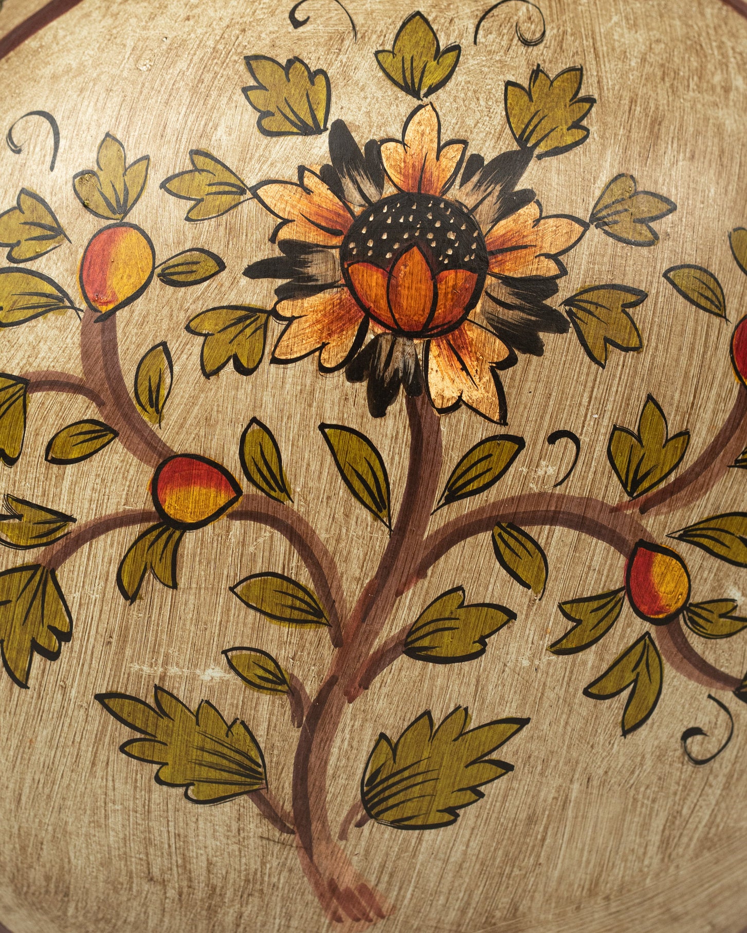 Sa forme plate et ronde, associée à un col beige, en fait une pièce à la fois originale et raffinée. Le fond jaune pâle contraste avec les décorations orange, vert et jaune sublimées par des détails végétaux peints avec précision. Chaque pot est une œuvre unique, témoignant du savoir-faire et de la richesse artistique de l’artisanat indien.