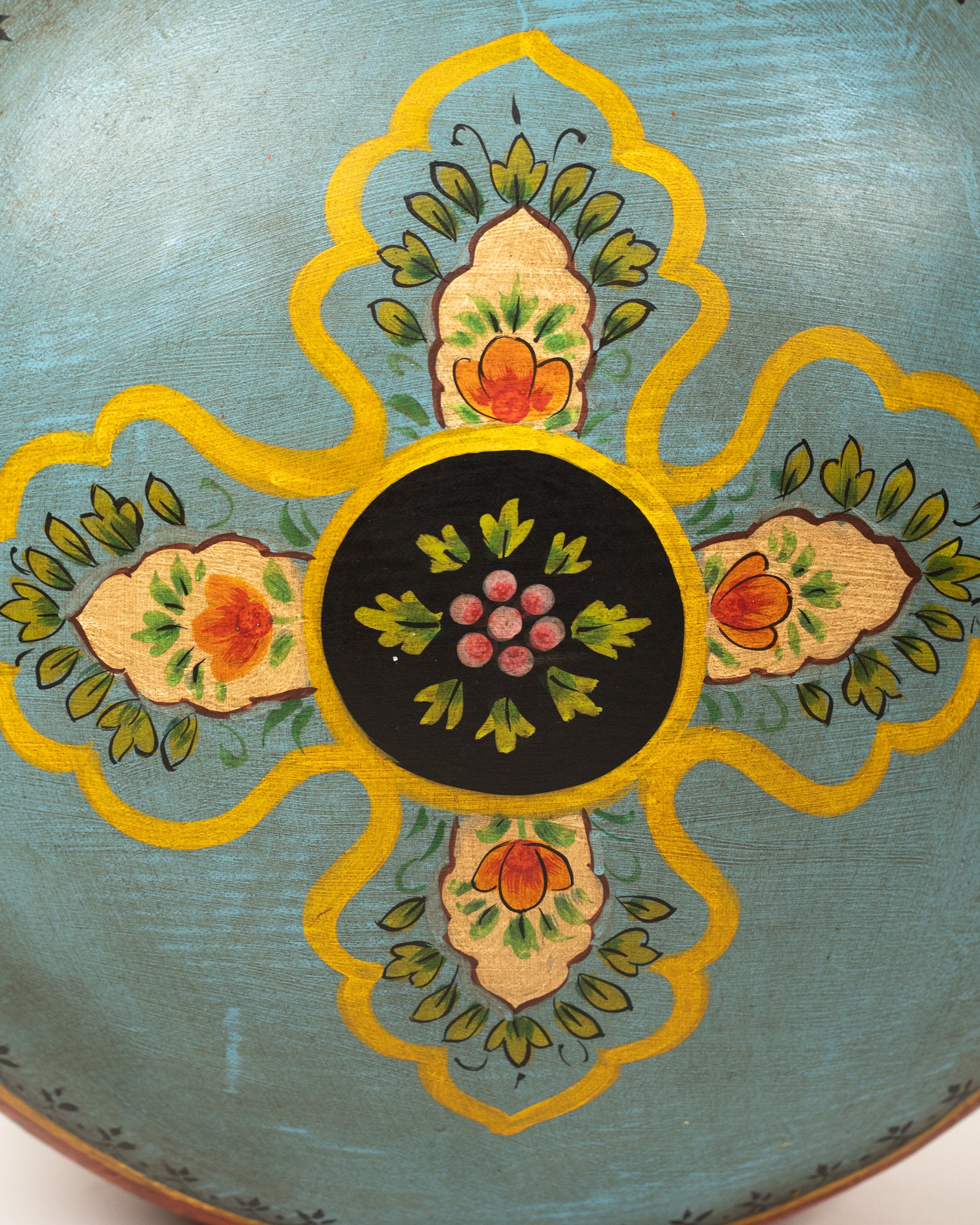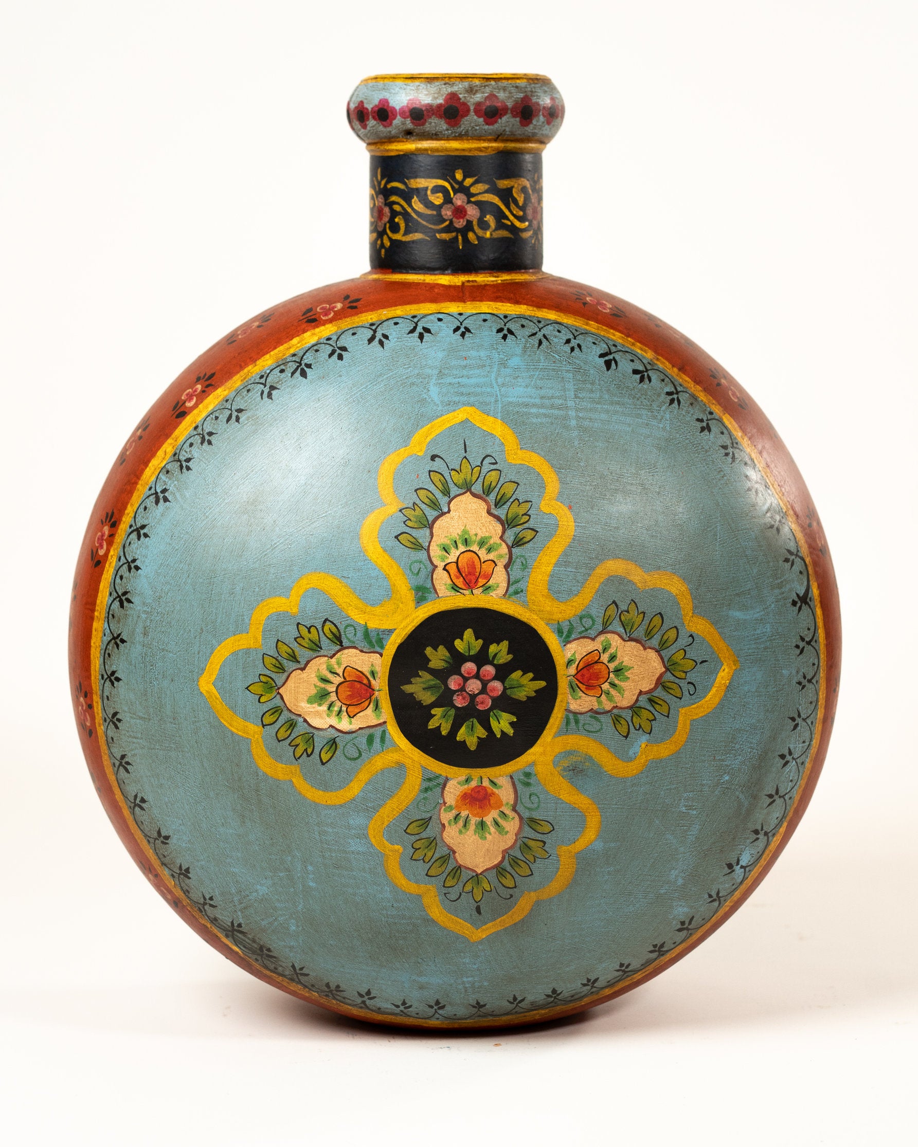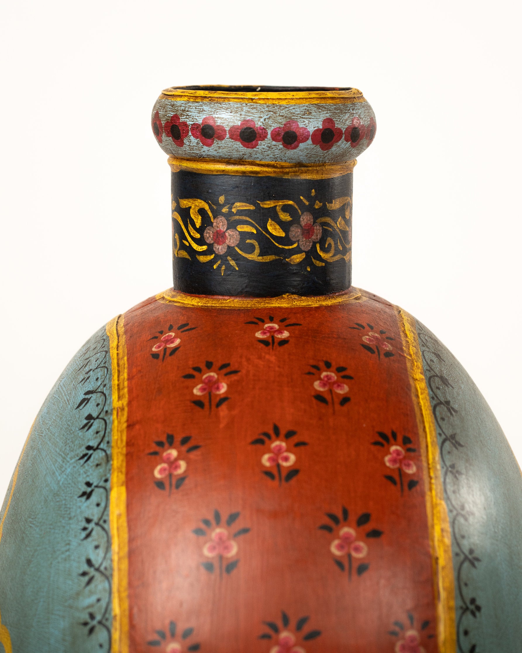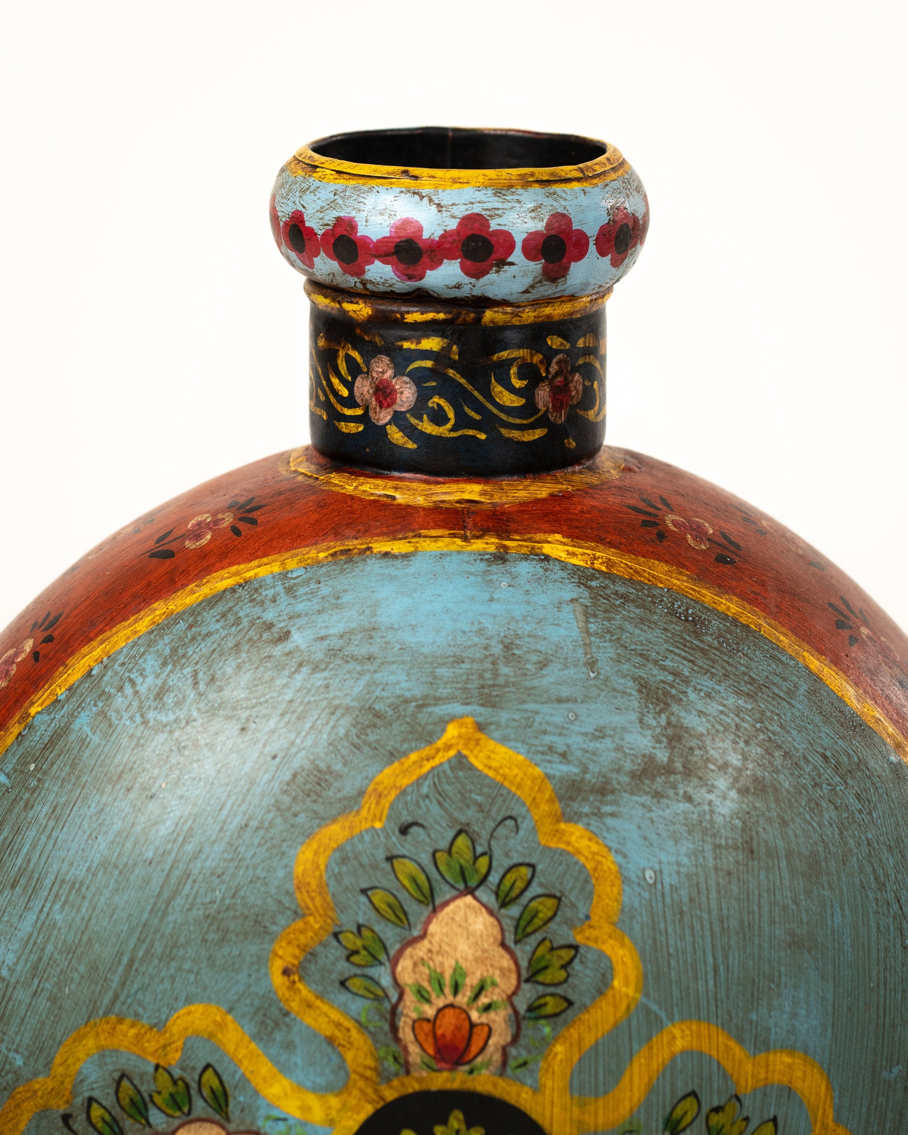 Sa forme plate et ronde, associée à un col décoré, en fait une pièce à la fois originale et raffinée. Le fond bleu clair contraste avec les décorations jaune et orange sublimées par des détails végétaux peints avec précision. Chaque pot est une œuvre unique, témoignant du savoir-faire et de la richesse artistique de l’artisanat indien.
